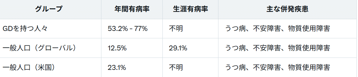この比較から、GDを持つ人々の精神疾患併発率は一般人口の2.3倍から6.2倍高いことが明らかである。